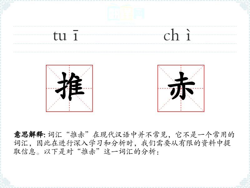 词汇“推赤”在现代汉语中并不常见,它不是一个常用的词汇,因此在进行深入学*和分析时,我们需要从有限的资料中提取信息。以下是对“推赤”这一词汇的分析: