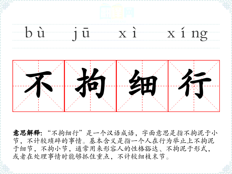 “不拘细行”是一个汉语成语,字面意思是指不拘泥于小节,不计较琐碎的事情。基本含义是指一个人在行为举止上不拘泥于细节,不拘小节,通常用来形容人的性格豁达、不拘泥于形式,或者在处理事情时能够抓住重点,不计较细枝末节。