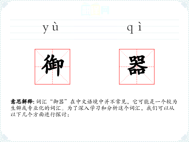 词汇“御器”在中文语境中并不常见,它可能是一个较为生僻或专业化的词汇。为了深入学*和分析这个词汇,我们可以从以下几个方面进行探讨:
