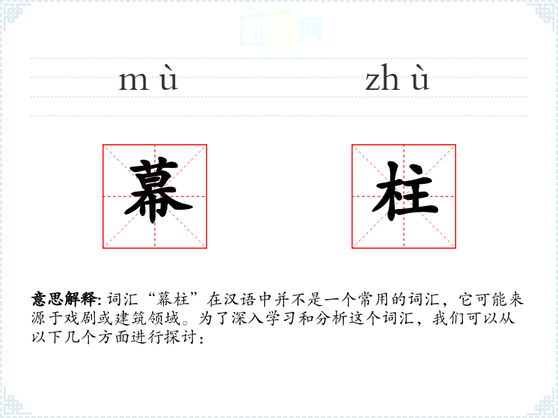 词汇“幕柱”在汉语中并不是一个常用的词汇,它可能来源于戏剧或建筑领域。为了深入学习和分析这个词汇,我们可以从以下几个方面进行探讨: