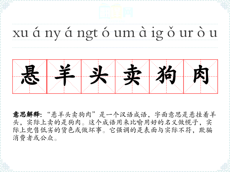 “悬羊头卖狗肉”是一个汉语成语,字面意思是悬挂着羊头,实际上卖的是狗肉。这个成语用来比喻用好的名义做幌子,实际上兜售低劣的货色或做坏事。它强调的是表面与实际不符,欺骗消费者或公众。