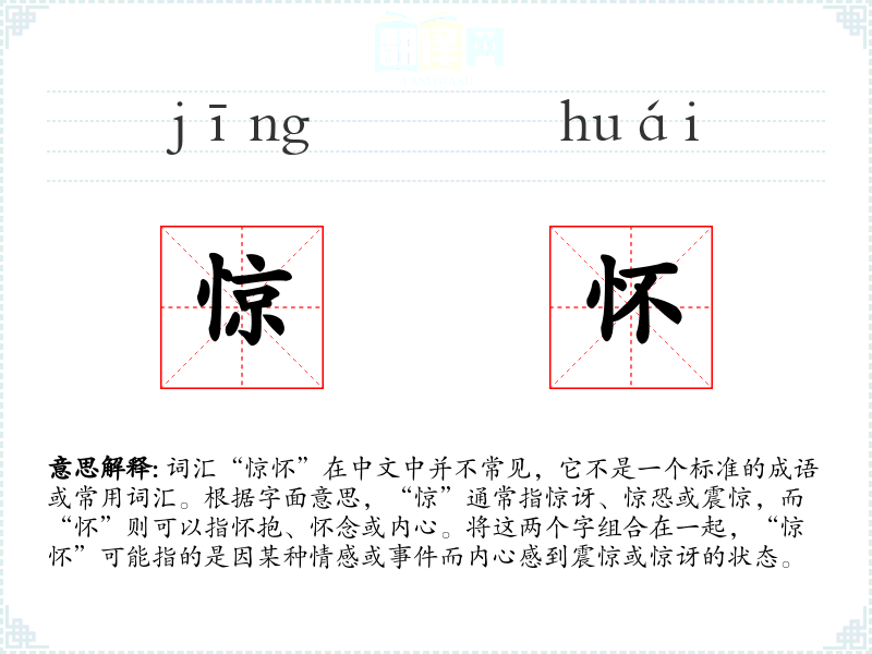 由于“惊怀”不是一个常用词汇,它在不同语言或文化中的对应词汇可能较为有限。在其他语言中,可能需要使用更具体的词汇来表达类似的情感状态。