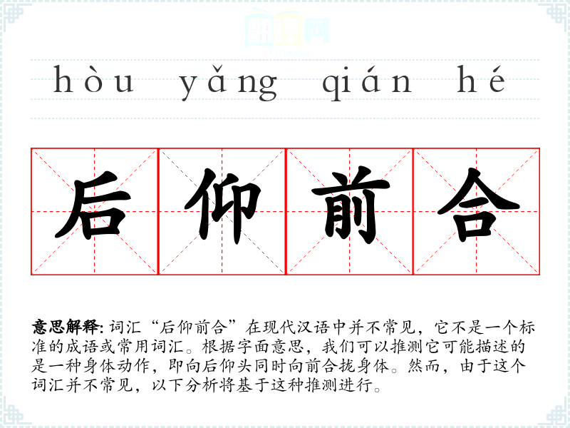 词汇“后仰前合”在现代汉语中并不常见,它不是一个标准的成语或常用词汇。根据字面意思,我们可以推测它可能描述的是一种身体动作,即向后仰头同时向前合拢身体。然而,由于这个词汇并不常见,以下分析将基于这种推测进行。