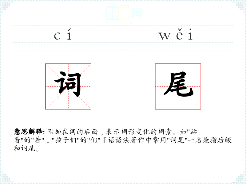 附加在词的后面﹐表示词形变化的词素。如"站着"的"着"﹐"孩子们"的"们"『语语法著作中常用"词尾"一名兼指后缀和词尾。