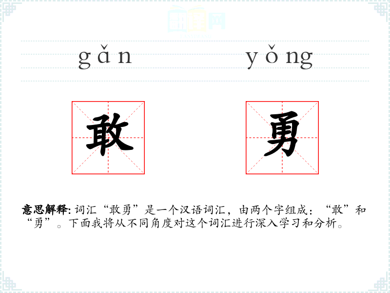 - 字面意思:“敢”表示有勇气去做某事,不畏惧困难或危险;“勇”表示勇敢,有胆量。