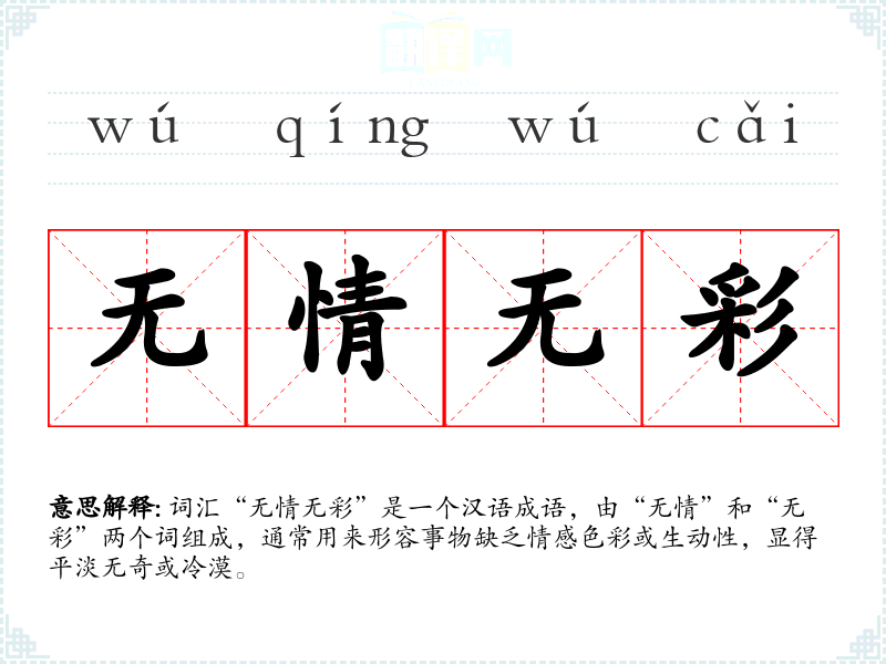 词汇“无情无彩”是一个汉语成语,由“无情”和“无彩”两个词组成,通常用来形容事物缺乏情感色彩或生动性,显得平淡无奇或冷漠。