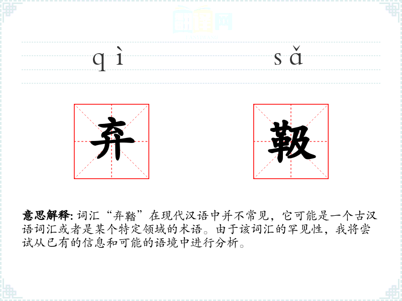 词汇“弃鞜”在现代汉语中并不常见,它可能是一个古汉语词汇或者是某个特定领域的术语。由于该词汇的罕见性,我将尝试从已有的信息和可能的语境中进行分析。