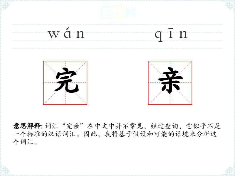 词汇“完亲”在中文中并不常见,经过查询,它似乎不是一个标准的汉语词汇。因此,我将基于假设和可能的语境来分析这个词汇。