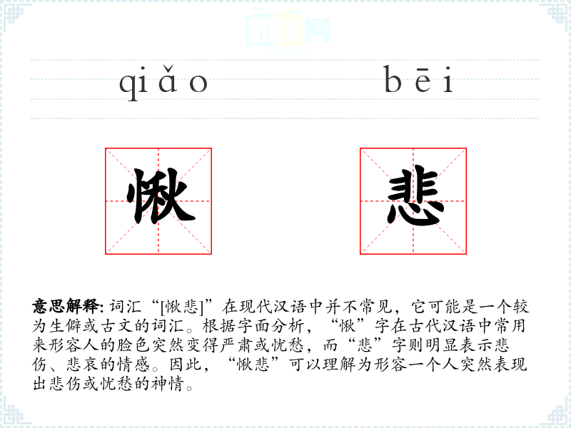 词汇“[愀悲]”在现代汉语中并不常见,它可能是一个较为生僻或古文的词汇。根据字面分析,“愀”字在古代汉语中常用来形容人的脸色突然变得严肃或忧愁,而“悲”字则明显表示悲伤、悲哀的情感。因此,“愀悲”可以理解为形容一个人突然表现出悲伤或忧愁的神情。