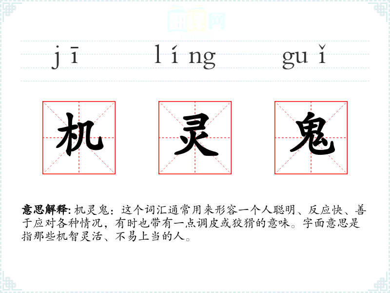 机灵鬼:这个词汇通常用来形容一个人聪明、反应快、善于应对各种情况,有时也带有一点调皮或狡猾的意味。字面意思是指那些机智灵活、不易上当的人。