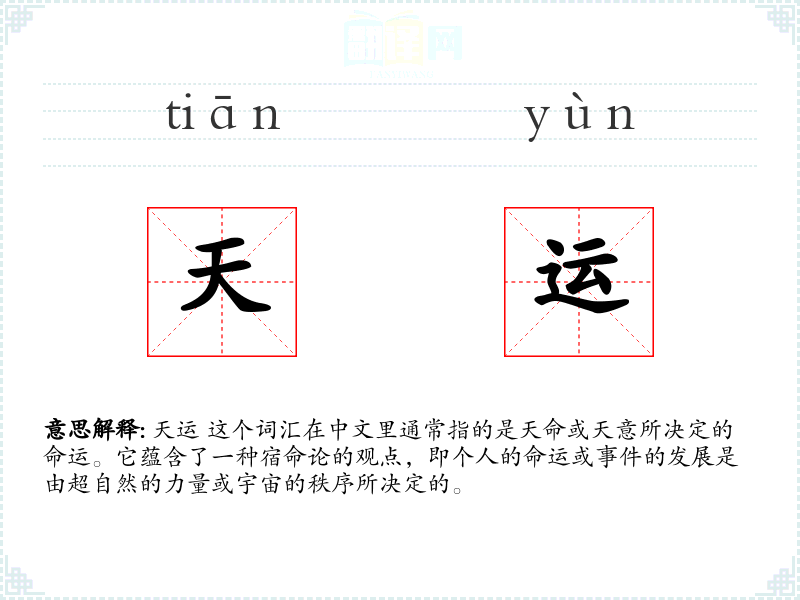 天运 这个词汇在中文里通常指的是天命或天意所决定的命运。它蕴含了一种宿命论的观点,即个人的命运或**的发展是由超自然的力量或宇宙的秩序所决定的。