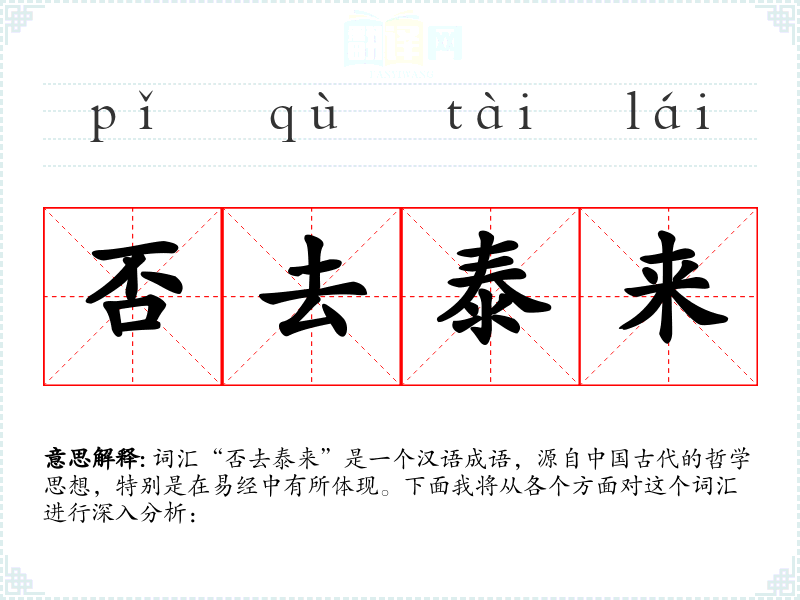 词汇“否去泰来”是一个汉语成语,源自**古代的哲学思想,特别是在易经中有所体现。下面我将从各个方面对这个词汇进行深入分析: