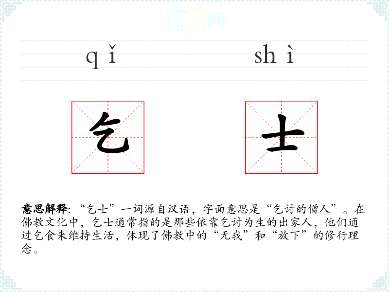 “乞士”一词源自汉语,字面意思是“乞讨的僧人”。在文化中,乞士通常指的是那些依靠乞讨为生的出家人,他们通过乞食来维持生活,体现了中的“无我”和“放下”的修行理念。