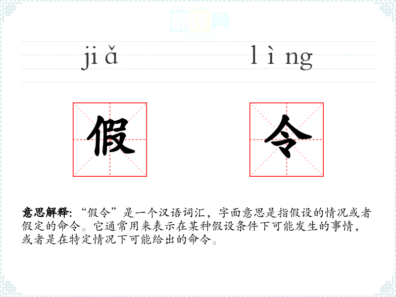 “假令”是一个汉语词汇,字面意思是指假设的情况或者假定的命令。它通常用来表示在某种假设条件下可能发生的事情,或者是在特定情况下可能给出的命令。