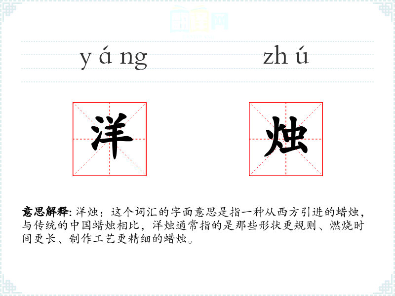 洋烛:这个词汇的字面意思是指一种从西方引进的蜡烛,与传统的**蜡烛相比,洋烛通常指的是那些形状更规则、燃烧时间更长、制作工艺更精细的蜡烛。