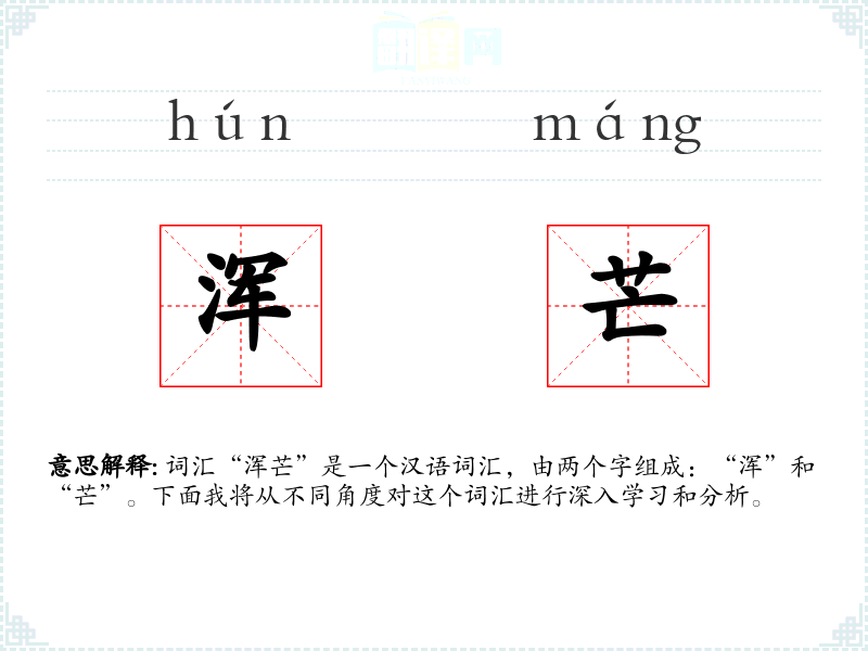 词汇“浑芒”是一个汉语词汇,由两个字组成:“浑”和“芒”。下面我将从不同角度对这个词汇进行深入学*和分析。