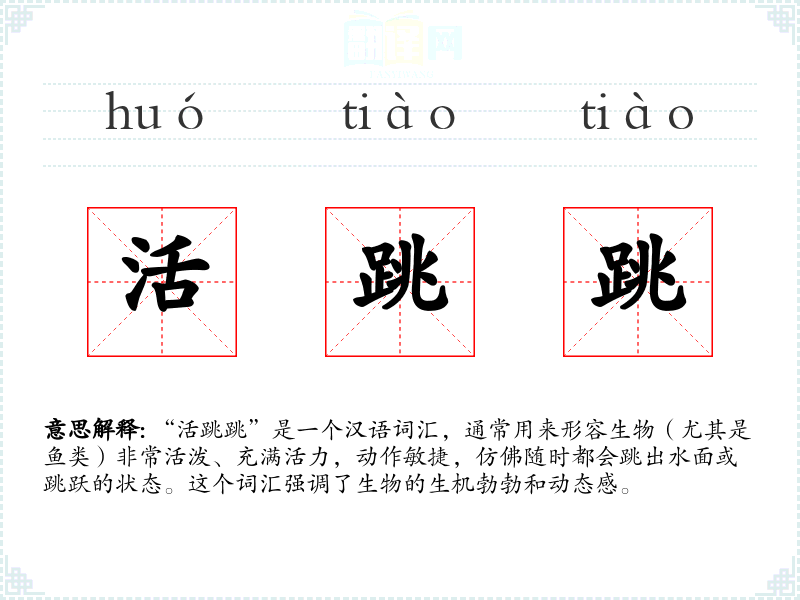 “活跳跳”这个词汇的构成是典型的汉语叠词形式,通过重复“跳”字来加强语气,表达更加生动的效果。这种用法在汉语中很常见,用以增强描述的力度和形象感。
