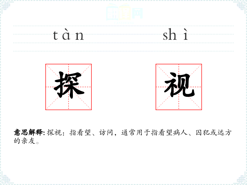 探视:指看望、访问,通常用于指看望病人、囚犯或远方的亲友。