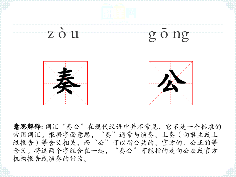 “奏”字在古代汉语中常用于指向上级报告或演奏音乐,而“公”字则一直与公共、官方相关。将这两个字组合在一起,可能是为了强调行为的正式性和公共性。