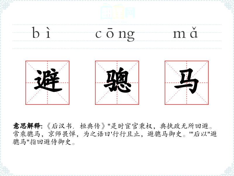 。常乘骢马,京师畏惮,为之语曰'行行且止,避骢马御史。'"后以"避骢马"指回避侍御史。