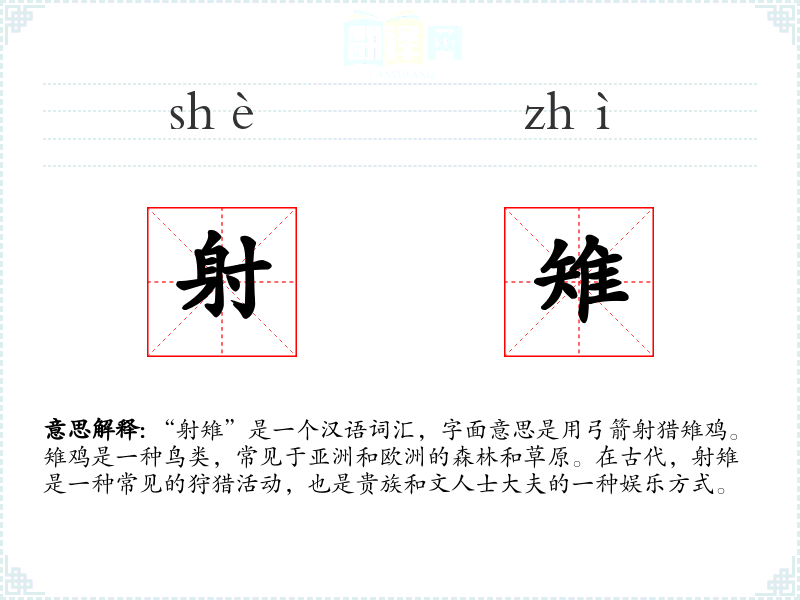 “射雉”是一个汉语词汇,字面意思是用弓箭射猎雉鸡。雉鸡是一种鸟类,常见于亚洲和欧洲的森林和草原。在古代,射雉是一种常见的狩猎活动,也是贵族和文人士大夫的一种娱乐方式。
