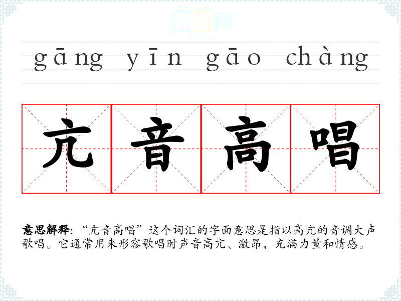 “亢音高唱”这个词汇由“亢音”和“高唱”两个词组成。“亢音”源自古代汉语,意指高亢的声音;“高唱”则指大声歌唱。这两个词结合,形成了描述高亢激昂歌唱的词汇。