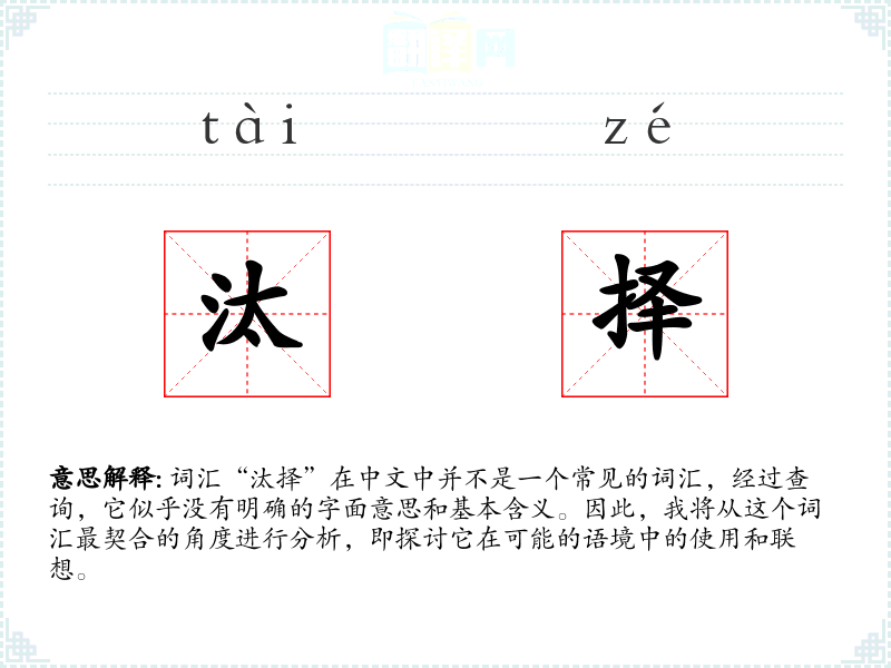 词汇“汰择”在中文中并不是一个常见的词汇,经过查询,它似乎没有明确的字面意思和基本含义。因此,我将从这个词汇最契合的角度进行分析,即探讨它在可能的语境中的使用和联想。