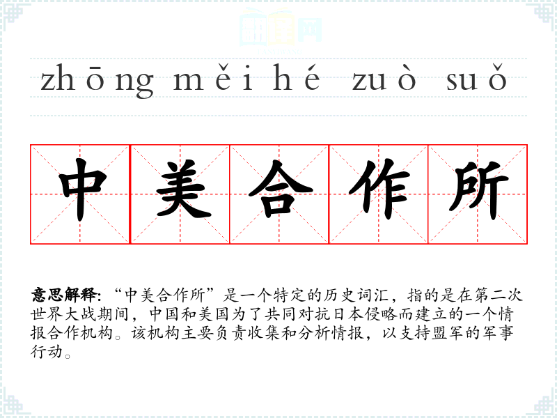 “中美合作所”是一个特定的历史词汇,指的是在第二次世界大战期间,**和美国为了共同对抗日本侵略而建立的一个情报合作机构。该机构主要负责收集和分析情报,以支持盟军的军事行动。