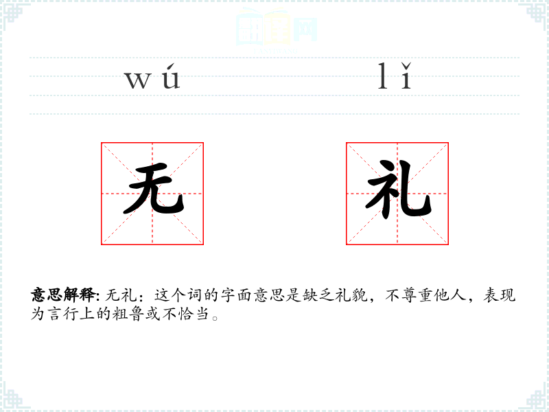 无礼:这个词的字面意思是缺乏礼貌,不尊重他人,表现为言行上的粗鲁或不恰当。