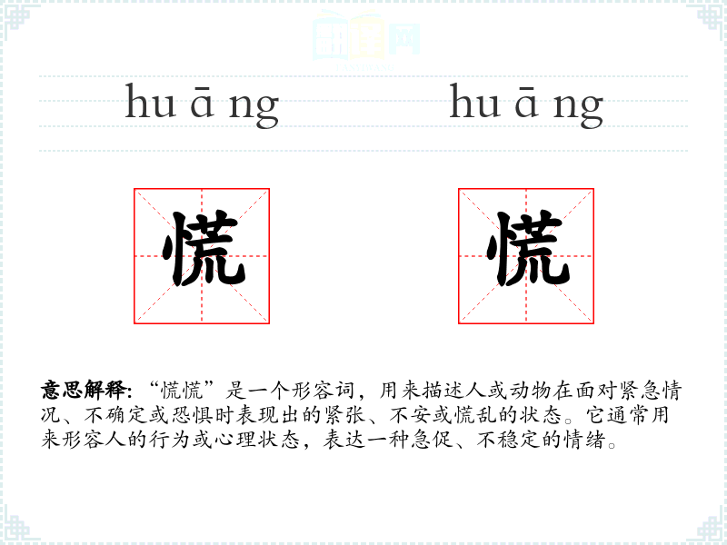 “慌慌”是一个形容词,用来描述人或动物在面对紧急情况、不确定或恐惧时表现出的紧张、不安或慌乱的状态。它通常用来形容人的行为或心理状态,表达一种急促、不稳定的情绪。