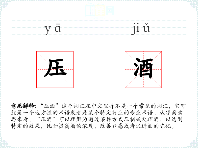 对于喜欢品酒的人来说,“压酒”可能唤起对传统酿酒工艺的尊重和欣赏。它可能让人联想到手工酿造的酒品,以及与这些酒品相关的温馨记忆。