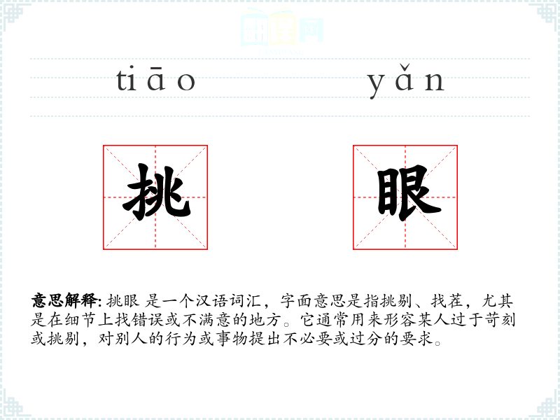 挑眼 是一个汉语词汇,字面意思是指挑剔、找茬,尤其是在细节上找错误或不满意的地方。它通常用来形容某人过于苛刻或挑剔,对别人的行为或事物提出不必要或过分的要求。