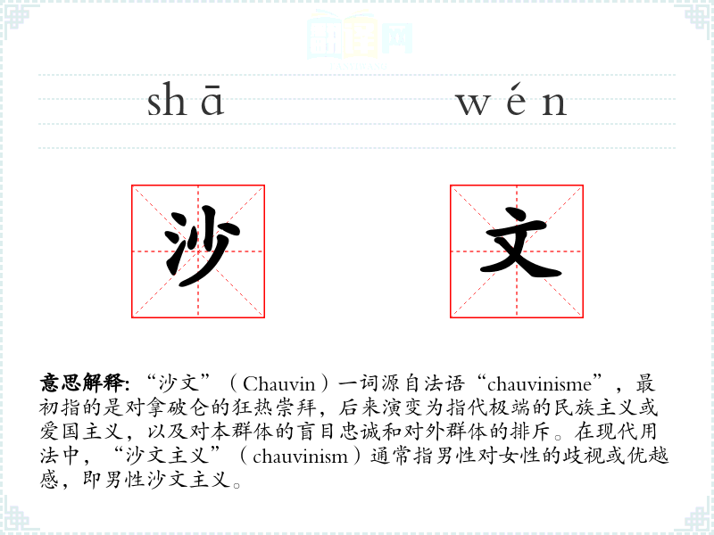 “沙文”(Chauvin)一词源自法语“chauvinisme”,最初指的是对拿破仑的狂热崇拜,后来演变为指代极端的民族主义或爱国主义,以及对本群体的盲目忠诚和对外群体的排斥。在现代用法中,“沙文主义”(chauvinism)通常指男性对女性的歧视或优越感,即男性沙文主义。