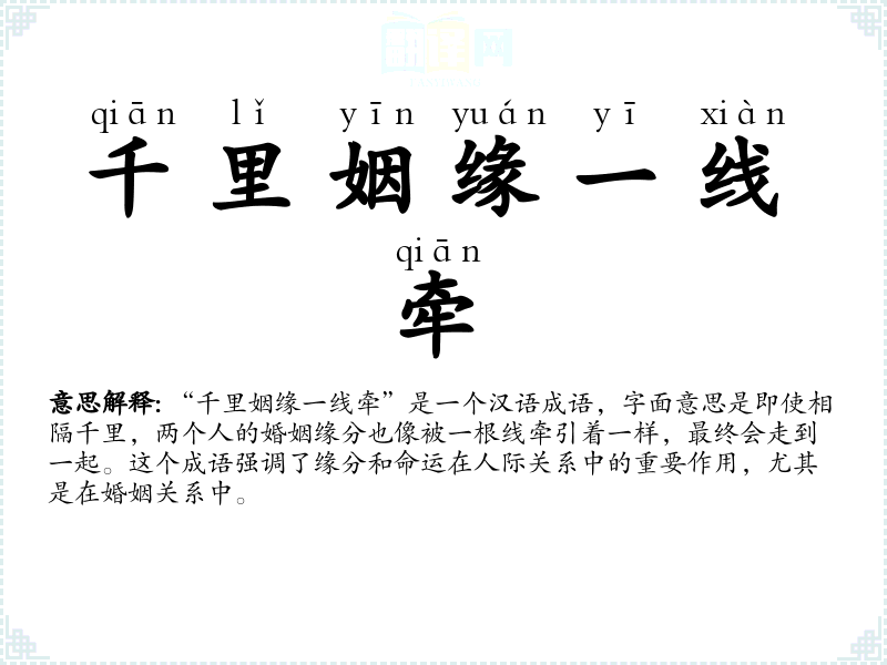 “千里姻缘一线牵”是一个汉语成语,字面意思是即使相隔千里,两个人的婚姻缘分也像被一根线牵引着一样,最终会走到一起。这个成语强调了缘分和命运在人际关系中的重要作用,尤其是在婚姻关系中。