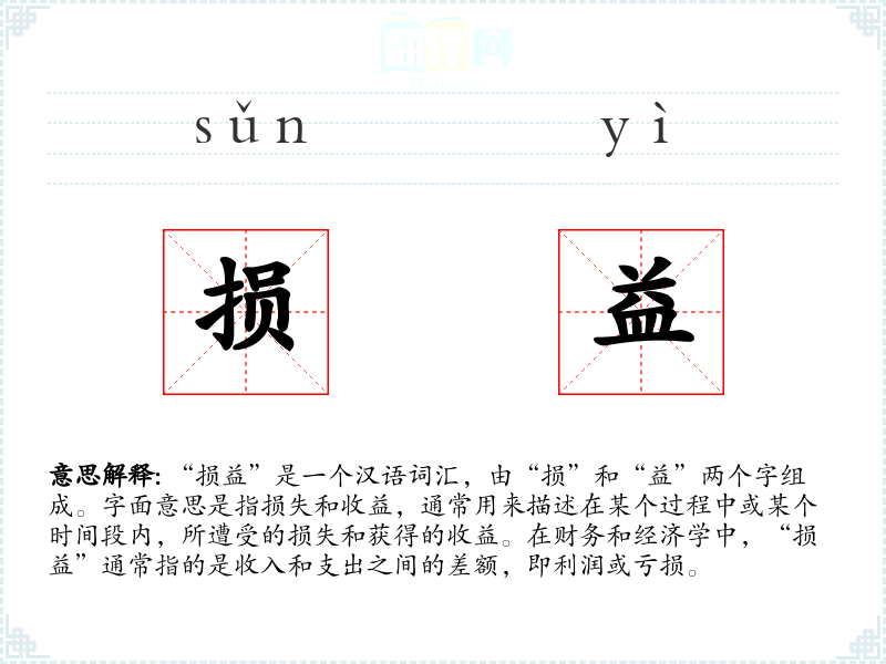 “损益”是一个汉语词汇,由“损”和“益”两个字组成。字面意思是指损失和收益,通常用来描述在某个过程中或某个时间段内,所遭受的损失和获得的收益。在财务和经济学中,“损益”通常指的是收入和支出之间的差额,即利润或亏损。