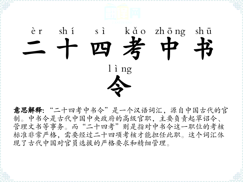 “二十四考中书令”源自中国古代的官制,具体的历史背景可以追溯到唐朝。随着时间的推移,这个词汇逐渐被用来形容任何经过严格选拔和考核的过程或结果。