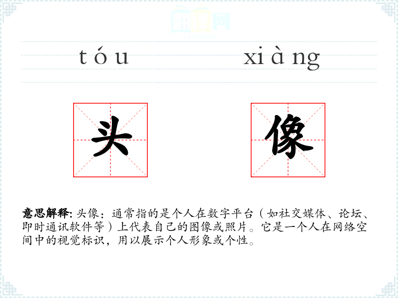 - 反义词:无(头像本身是一个中性词,没有直接的反义词)
