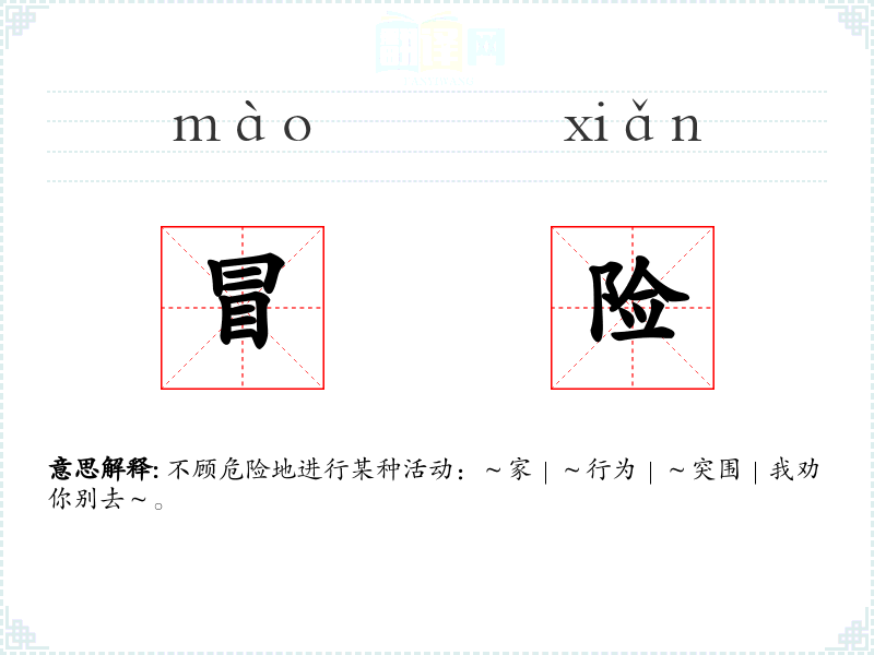 1.不顾危险地进行某种活动:~家|~行为|~突围|我劝你别去~。 2.1. 敢于尝试新事物。 3.2. 承担风险。 4.探索未知领域。 5.4. 挑战极限。 6.5. 不畏艰险。 7.*. 寻求刺激。 8.7. 勇往直前。