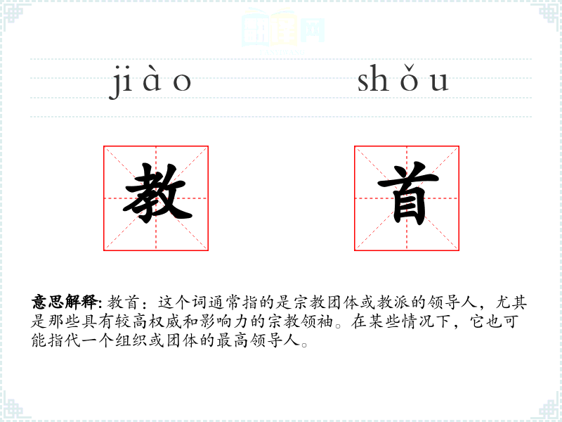 教首:这个词通常指的是团体或教派的领导人,尤其是那些具有较高权威和影响力的领袖。在某些情况下,它也可能指代一个组织或团体的最高领导人。