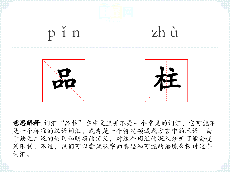 总的来说,“品柱”可能是一个特定领域或方言中的术语,对于大多数人来说,它不是一个熟悉的词汇。在语言学习和表达中,了解特定领域或地区的术语是很重要的,但“品柱”作为一个词汇,其使用和理解可能需要特定的背景知识。
