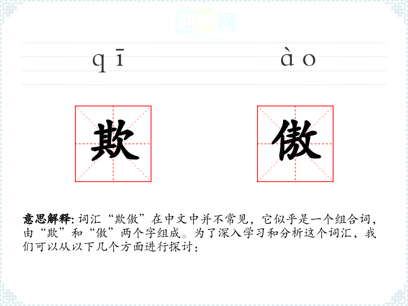 词汇“欺傲”在中文中并不常见,它似乎是一个组合词,由“欺”和“傲”两个字组成。为了深入学习和分析这个词汇,我们可以从以下几个方面进行探讨: