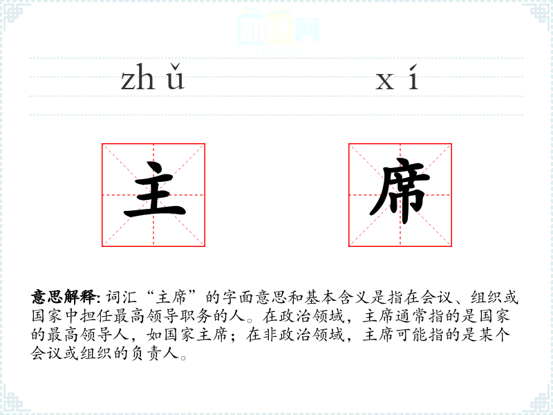 词汇“主席”的字面意思和基本含义是指在会议、组织或国家中担任最高领导职务的人。在政治领域,主席通常指的是国家的最高领导人,如国家主席;在非政治领域,主席可能指的是某个会议或组织的负责人。