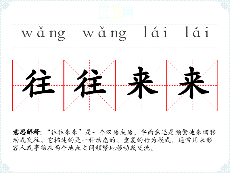 “往往来来”是一个汉语成语,字面意思是频繁地来回移动或交往。它描述的是一种动态的、重复的行为模式,通常用来形容人或事物在两个地点之间频繁地移动或交流。