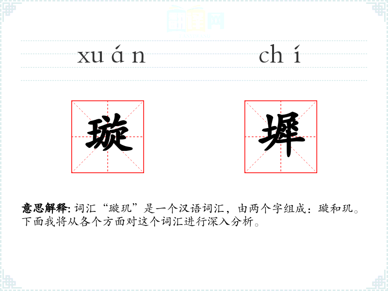 璇(xuán):古代指美玉,也用来形容星宿,如北斗七星中的第二颗星称为“璇”。 玑(jī):古代指不圆的珠子,也指小珠或小石。