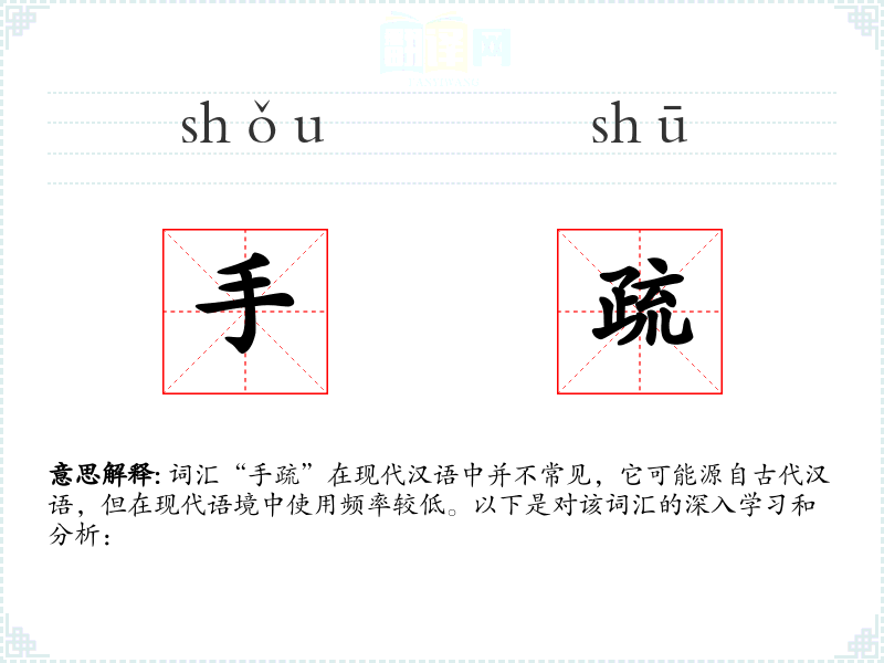 词汇“手疏”在现代汉语中并不常见,它可能源自古代汉语,但在现代语境中使用频率较低。以下是对该词汇的深入学*和分析: