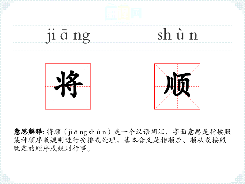 将顺(jiāng shùn)是一个汉语词汇,字面意思是指按照某种顺序或规则进行安排或处理。基本含义是指顺应、顺从或按照既定的顺序或规则行事。