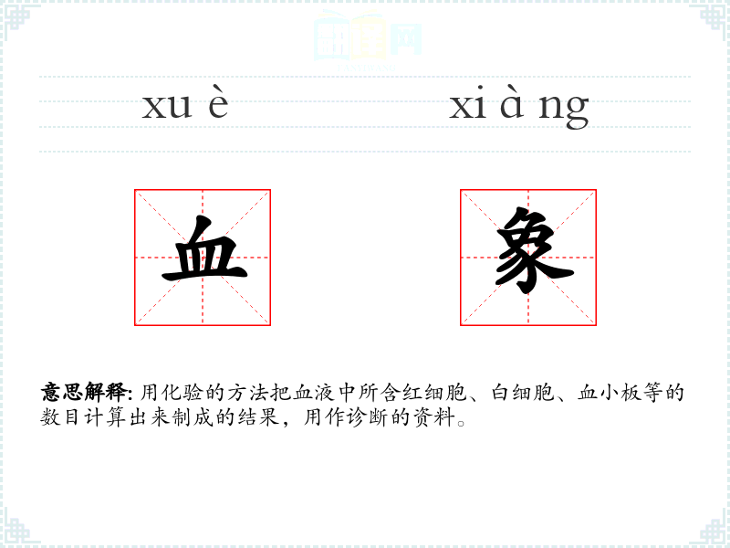用化验的方法把血液中所含红细胞、白细胞、血小板等的数目计算出来制成的结果,用作诊断的资料。