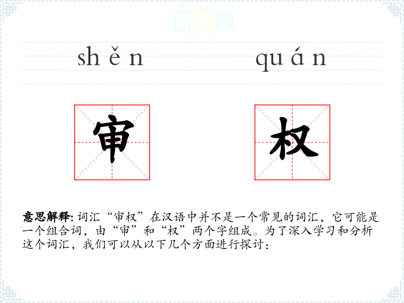 词汇“审权”在汉语中并不是一个常见的词汇,它可能是一个组合词,由“审”和“权”两个字组成。为了深入学习和分析这个词汇,我们可以从以下几个方面进行探讨:
