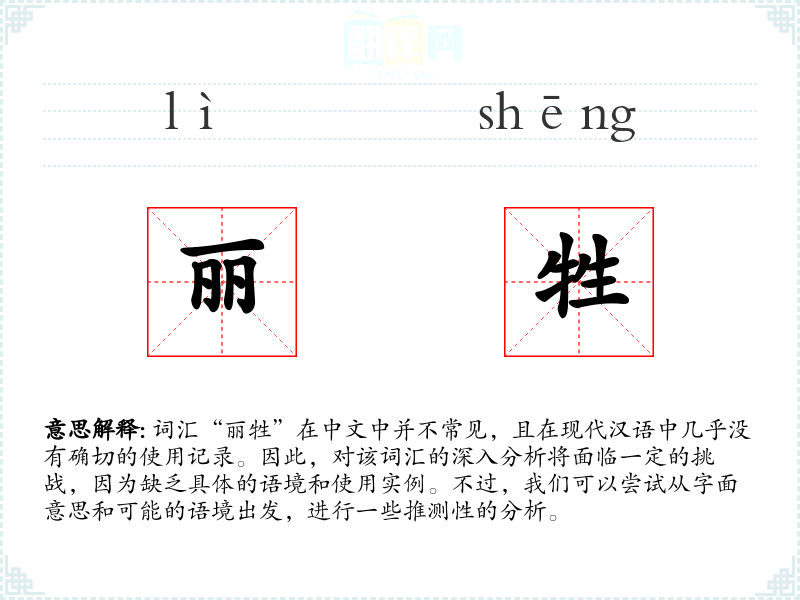 词汇“丽牲”在中文中并不常见,且在现代汉语中几乎没有确切的使用记录。因此,对该词汇的深入分析将面临一定的挑战,因为缺乏具体的语境和使用实例。不过,我们可以尝试从字面意思和可能的语境出发,进行一些推测性的分析。