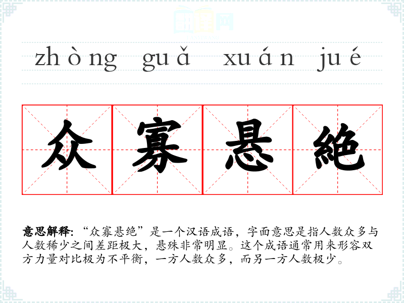 “众寡悬绝”是一个汉语成语,字面意思是指人数众多与人数稀少之间差距极大,悬殊非常明显。这个成语通常用来形容双方力量对比极为不平衡,一方人数众多,而另一方人数极少。